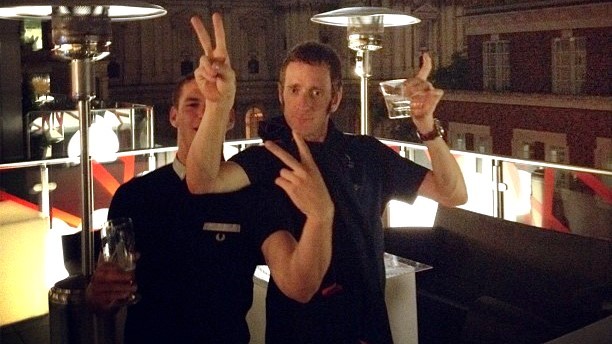 Bradley Wiggins uverejnil z osláv fotografiu aj na sociálnej sieti Twitter. Pod fotografiou, v ktorej drží v ruke nápoj a druhou ukazuje gesto v štýle V symbolizujúce víťazstvo, dopísal: "Do nemoty". Neskôr víťaz Tour de France dopísal, že v pití výrazne pokročil. "Opitý v priebehu minúty... Bolo to emotívne."