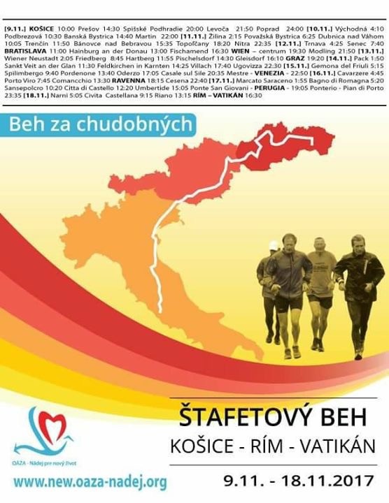 KOŠICE/BRATISLAVA/VATIKÁN / Už tri dni beží vytrvalý otec Gombita cez Slovensko. S odhodlaním a túžbou pomôcť chudobným chce zdolať 1 700 kilometrov dlhú trasu z Košíc do Vatikánu. Túto vzdialenosť sa mu podarilo zdolať už minulý rok, sprevádzal ho jeho verný psík. Tentoraz sa k nemu pridali bežci z celého Slovenska. V nedeľu mu robili spoločnosť aj naši kolegovia z bežeckého tímu televízie JOJ.